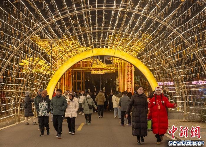 图为1月22日晚,河北省唐山市南湖旅游景区,搭客在灯会现场游览。赵杰 摄