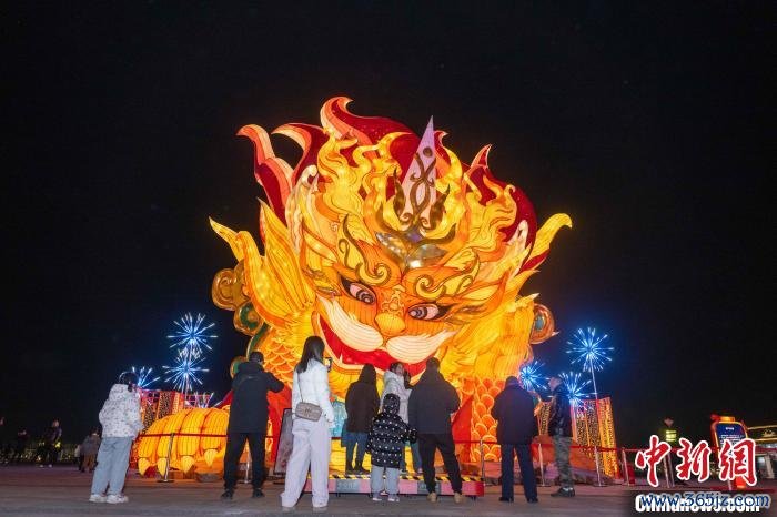 图为1月22日晚,河北省唐山市南湖旅游景区,搭客与“年兽”互动。赵杰 摄