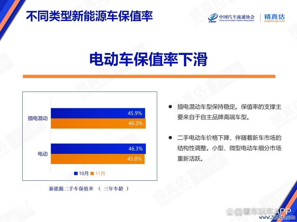 临了再来望望新能源车鸿沟,按能源类型来折柳,插电混动车型三年车型保值率为46.3%,环比10月的45.9%增长0.4%;纯电动车型的保值率为45.8%九游体育app官网,环比10月的46.3%下滑0.5%。陈述指出,插电混动车型保捏幽静,保值率的因循主要来自自主品牌高端车型。