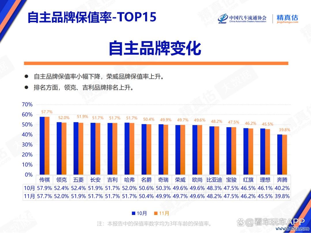 自主品牌方面,11月各品牌保值率出现小幅下滑。细分品牌中,位居榜首位置的还是是传祺,其保值率自2023年1月稀奇五菱后,排行捏续保捏第一,11月保值率为57.7%,但环比下滑0.2%;紧随后来的是领克和五菱,11月保值率分别为52.0%和51.9%;进入前六名的还包括长安汽车、祯祥汽车、哈弗,三者保值率均为51.7%。另外,名爵、奇瑞、荣威、欧尚、比亚迪、宝骏、红旗、理念念、奔腾也均进入榜单,保值率分别为50.4%、49.9%、49.7%、49.6%、48.2%、47.5%、46.2%、45.5%、39.8%。