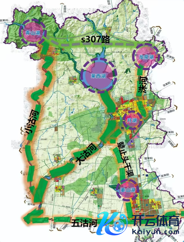 打造“一脉引颈,三水交汇,五湖联动,全域打造”总体布局。“一脉引颈”指大沽河—产芝水库组成的中枢水脉;“三水交汇”指小沽河、洙河、五沽河三条主要支活水系;“五湖联动”