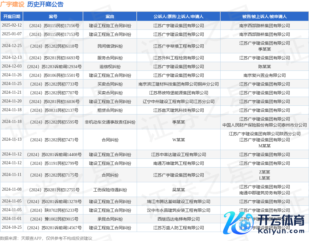 本站音讯,阐发天眼查APP浮现现金九游体育app平台,近日公布了一则江苏广宇竖立集团有限公司动作原告/上诉东说念主的开庭公告,详备实验如下: