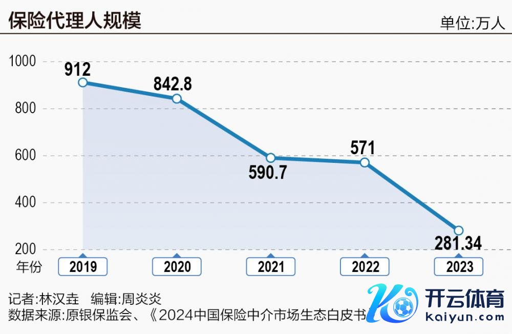 响应在数目方面,保障代理东谈主鸿沟在2019年达到顶峰后运转进入下跌通谈。《2024中国保障中介商场生态白皮书》夸耀,2023年东谈主身险公司保障营销东谈主员数目下跌势头不减,当今已降至不到281.34万东谈主,较2019年岑岭时代的912万东谈主减少约631万东谈主,基本跌至十二年前的水平。