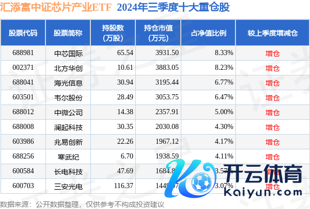 汇添富中证芯片产业ETF为指数型-股票基金,字据最新一期基金季报理会,该基金金钱设立:股票占净值比99.85%,无债券类金钱,现款占净值比0.22%。基金十大重仓股如下: