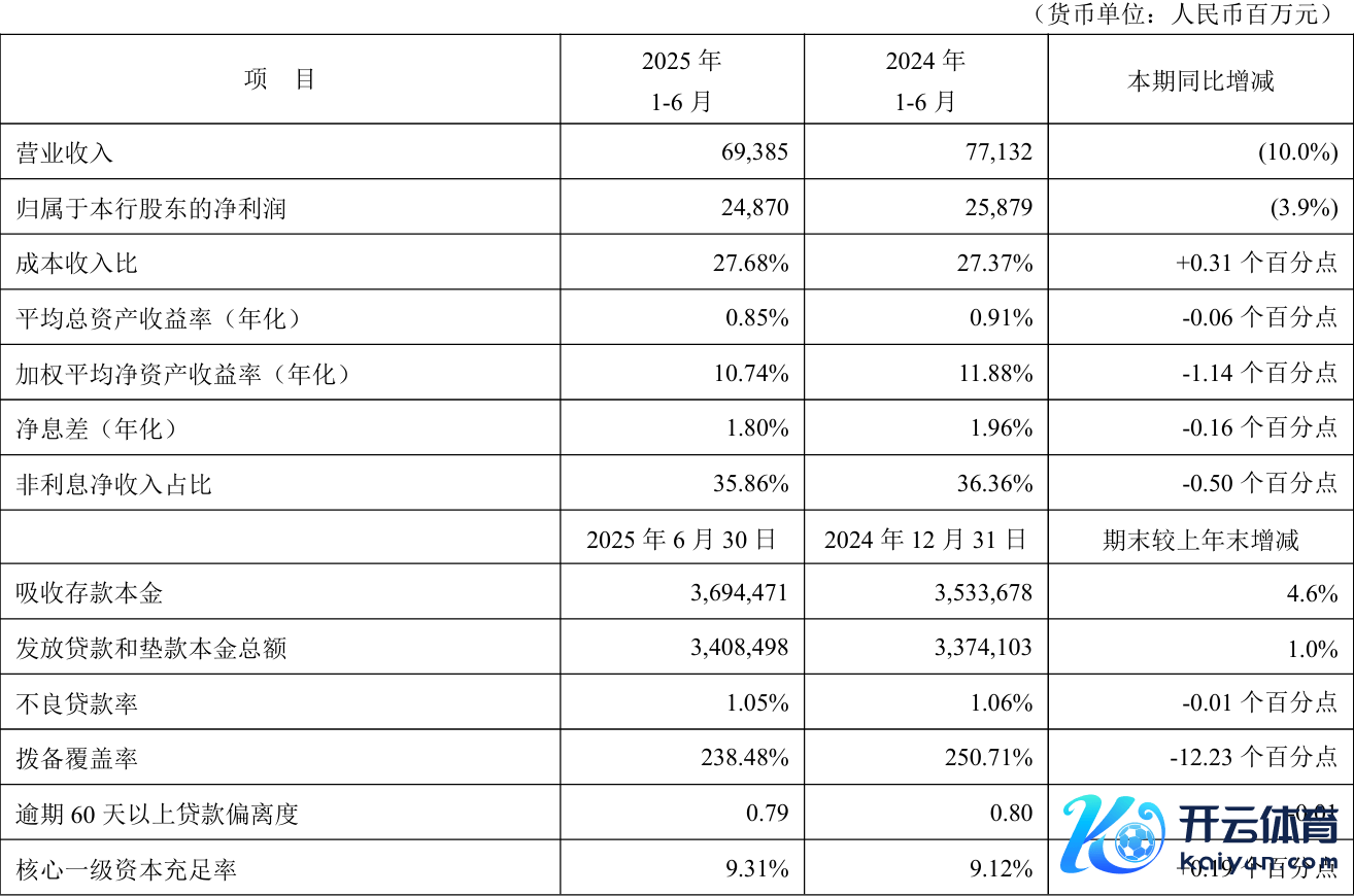 祥瑞银行(000001.SZ)露馅2025年半年报。上半年,本集团收尾营业收入693.85亿元,同比下降10.0%,主要受市集利率下行、贷款业务结构治疗等身分影响,净息差1.80%,较旧年同期下降16个基点;受市集波动影响,债券投资等业务非利息净收入下降。通过数字化转型开动降本增效,业务及经管费192.06亿元,同比下降9.0%;同期,加强金钱质地管控,加大不良金钱清收处置力度,信用罕见他金钱减值损失194.50亿元,同比下降16.0%。收尾净利润248.70亿元,同比下降3.9%,降幅较第一季度有所收窄。
