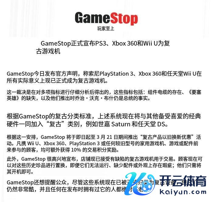 好意思国大型游戏零卖商GameStop于3月17日通过外交媒体发布声明称将肃肃把PS3、Xbox 360和Wii U列为\"相沿主机\"。这一决定激勉部分玩家热议,关于这些主机被归类为\"相沿\"感到诧异。