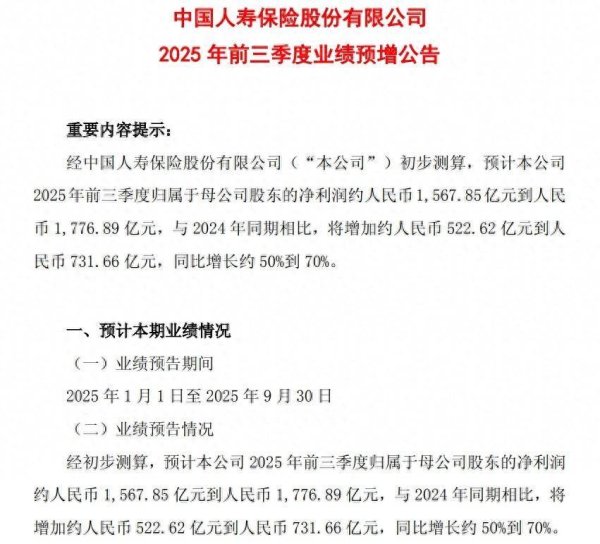 10月19日,中国东说念主寿(601628)发布公告,瞻望2025年前三季度归母净利润约为1567.85亿元到1776.89亿元,与2024年同时比较现金九游体育app平台,将增多约522.62亿元到731.66亿元,同比增长约50%到70%。 扣除非频繁性损益后,瞻望归母净利润约为1570.11亿元到1779.46亿元,相同与2024年同时比较,将增多约523.37亿元到732.72亿元。 公司称,本确认期事迹预增的主要原因是公司积极阐扬经济“减震器”和社会“雄厚器”功能,聚焦价值创造与效益