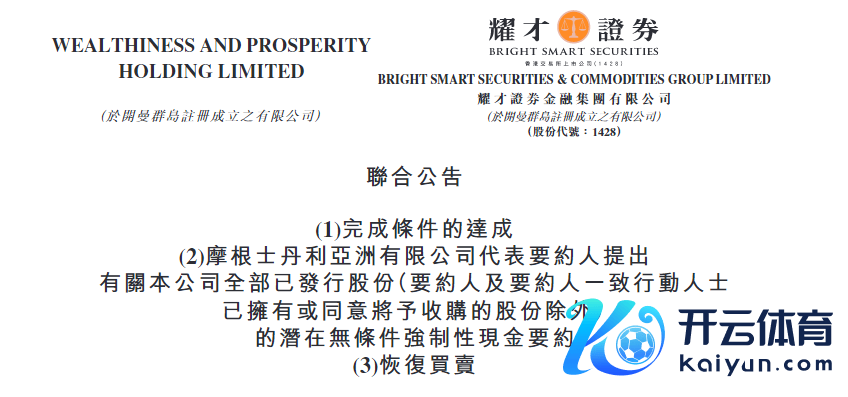 3月16日晚间,耀才证券金融公告默示,蚂纠合团发起的要约收购已通过中国商酌部门审批,展望将于3月30日完成交割。公司股票于17日早9点复原交游。