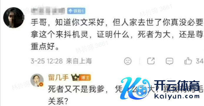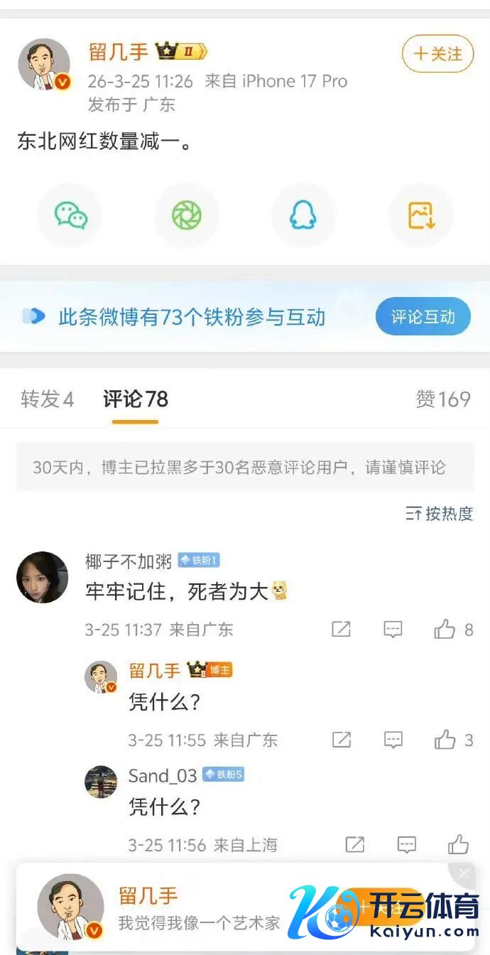 3月25日,留几手发文称“东北网红减一”,这被大齐解读为对张雪峰离世的暗射与辱弄。网友以“死者为大”的情理劝戒其保抓尊重时,留几手复兴说“凭什么?”。这条微博已不行见。