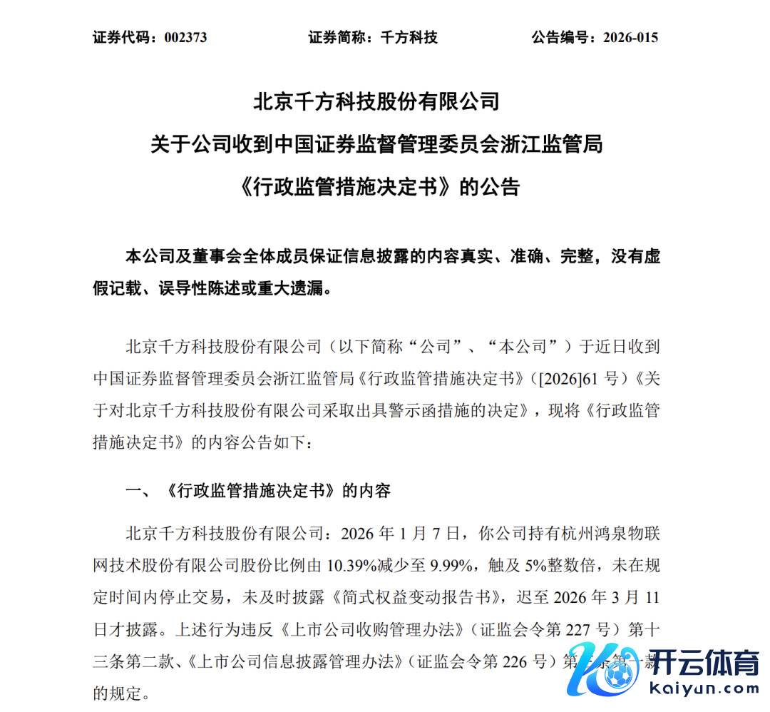 阐述《行政监管措施决定书》,2026年1月7日,千方科技捏有杭州鸿泉物联网时刻股份有限公司(简称“鸿泉时刻”)股份比例由10.39%减少至9.99%,波及5%整数倍,未在口头时天职住手交游,未实时泄露《简式权利变动讲演书》,迟至2026年3月11日才泄露。