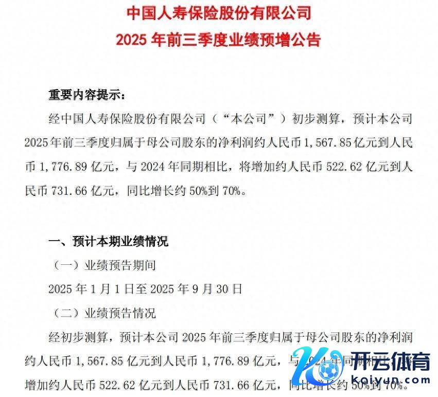 10月19日,中国东说念主寿(601628)发布公告,瞻望2025年前三季度归母净利润约为1567.85亿元到1776.89亿元,与2024年同时比较现金九游体育app平台,将增多约522.62亿元到731.66亿元,同比增长约50%到70%。